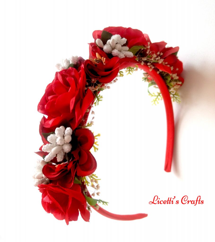 Para esta diadema hemos realizado una corona de flores rojas con pistilos en contraste de color blanco brillante.